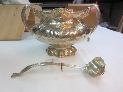 InscriptionsA: C F CURTIS scratched into underside near mark; B: CFC scratched into underside near markMarks and Labels/StampsA: "Martele" incuse in gothic letters, above Gorham's Lion-Anchor-G marks, the anchor topped with a spread-winged eagle; above "950-1000 FINE" above "SPAULDING & CO. / CHICAGO."; B: has the same mark,except arranged in a line, and lacking city name. Bowl code letters on base ANO; ladle code letters CKT. Code letters indicate that the punch bowl was completed 12/2/1901 and the ladle completed 3/3/1902.ProvenancePurchased by Iris Schwartz in the 1990s. Originally made for Charles F. Curtis (1846-1915) window and door manufacturer in Clinton, Iowa.Our online collection is a work in progress. It reflects only a portion of the entire collection and the ongoing work conducted over the course of our 115-year history. The objects presented may contain offensive racial, gender, sexual, religious, and other language and imagery, and their records may contain offensive and discriminatory language, or reflect outdated ideas and analyses. We are actively working to address these issues, and we welcome your feedback as we strive to improve our data and our practices. Please email us at registrar@newarkmuseumart.org if you have comments or information to share.